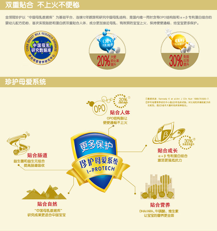 金领冠珍护系列,是伊利母婴营养研究中心依托“中国母乳数据库”,根据中国宝宝体质特点,结合伊 利母乳营养研究成果和德国专业技术,经过8年的潜心研究,3年的临床试验,在营养成分结构上最大程 度接近母乳的婴幼儿配方奶粉。
